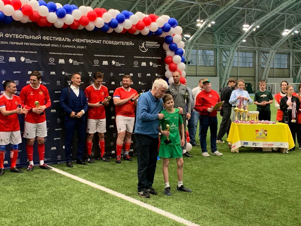 По окончании матча прошла торжественная церемония награждения победителей, призёров и участников - юные футболисты получили медали, кубки, памятные подарки с автографами из рук легендарных российских спортсменов!