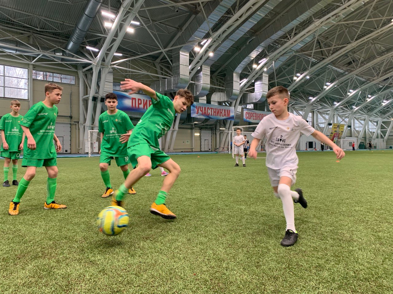 На газон манежа «Центр олимпийской подготовки» вышли восемь команд: «Стрела», «Наши дети», «Солнышко», «Спортивные львы», «Крылья комитета», «Комета дружбы», «Надежда», «Спартак»– воспитанники социальных учреждений Республики Мордовия, ребята из многодетных и малообеспеченных семей, а также команда юных футболистов, сформированная из детей участников СВО.